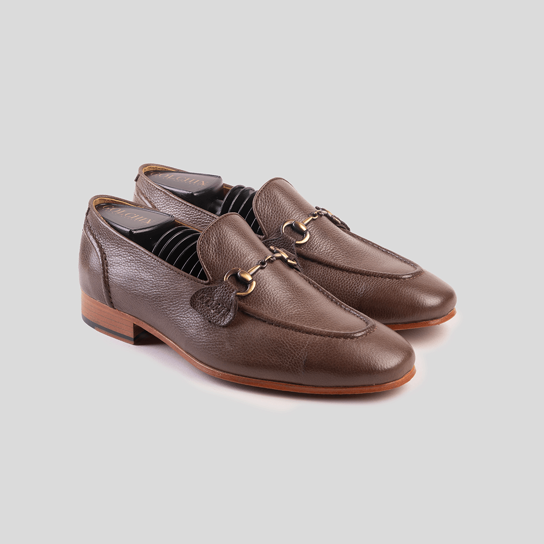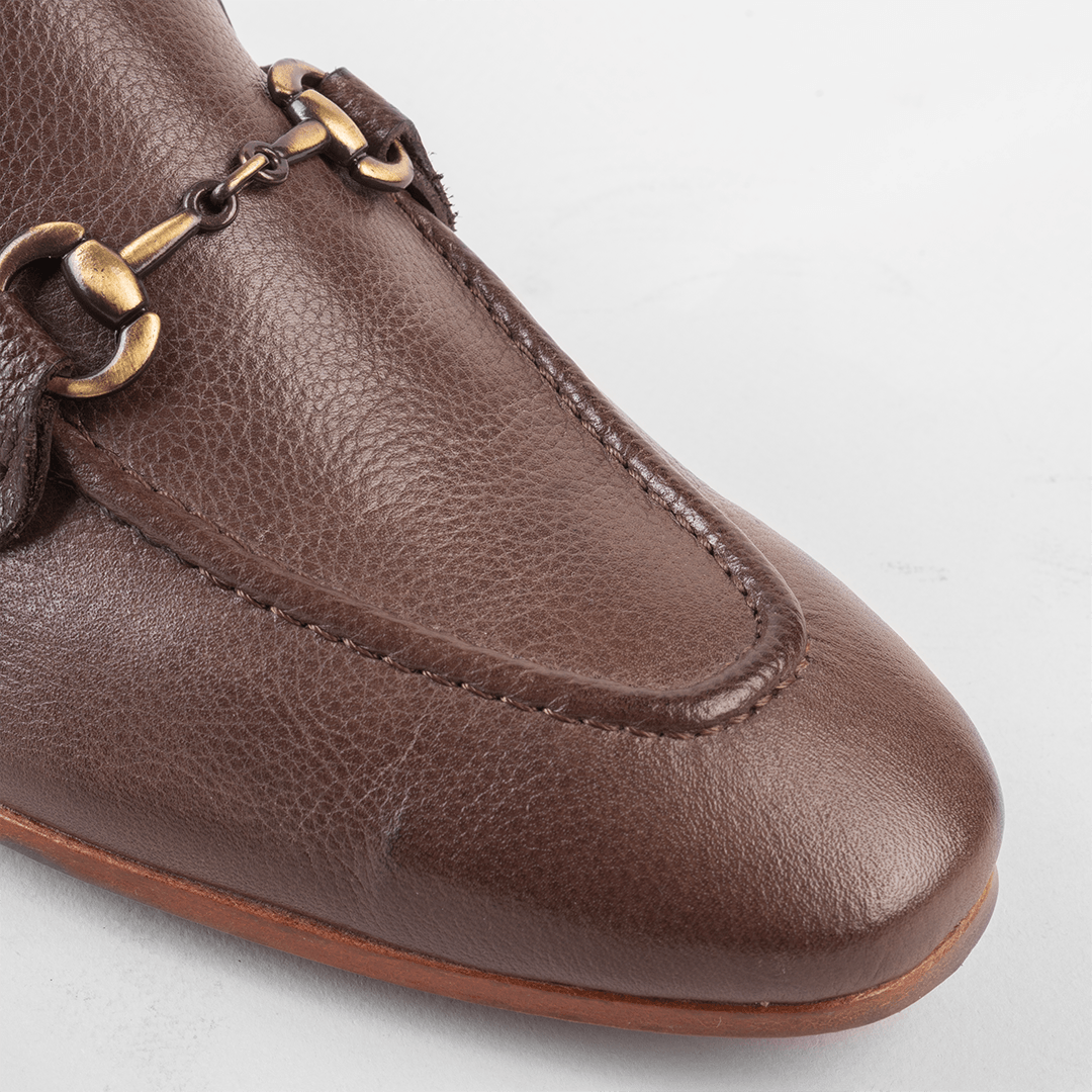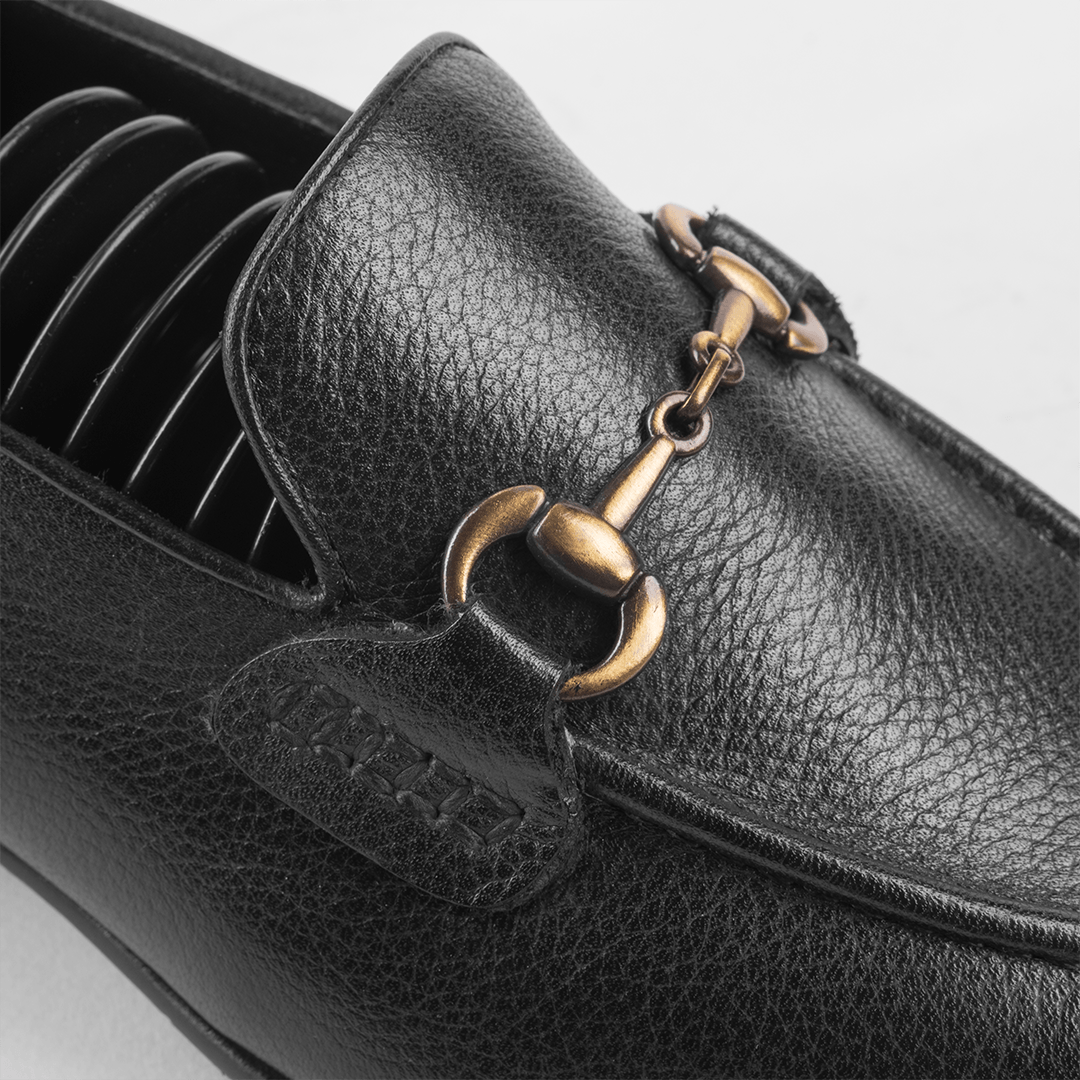 سگک فلزی اسبی (Horsebit) با پرداخت دقیق و رنگ فلزی براق، عنصر نمادین این مدل است که جلوهای رسمی و اصیل به طراحی کفش میبخشد.