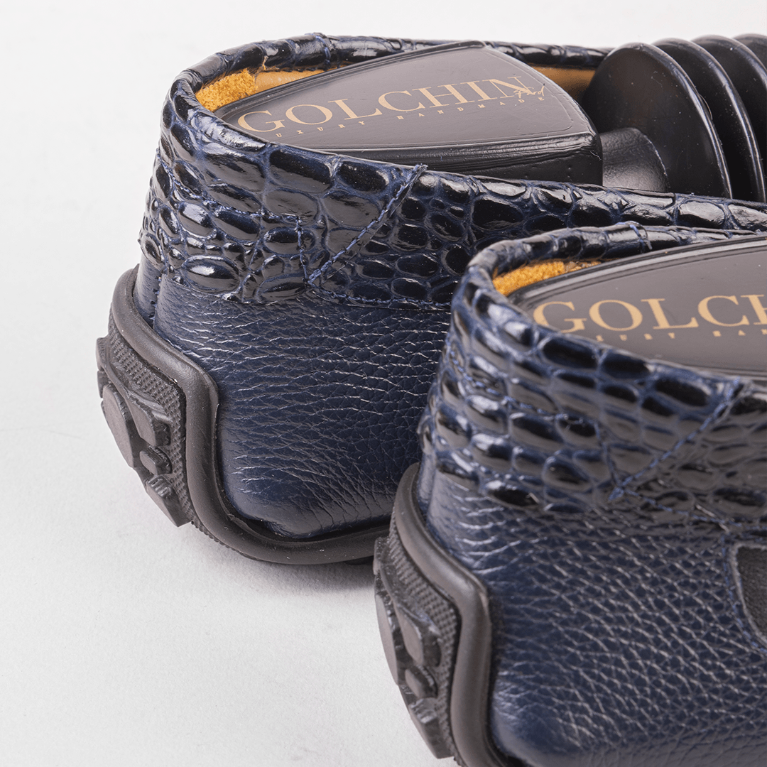 این مدل کالج مردانه، ترکیبی بینقص از طراحی کلاسیک با اجرای مدرن است. رویهی آن با تلفیق دو نوع چرم طبیعی – چرم فلوتر دانهدار و چرم گاوی طرح کروکودیل با بافت برجستهتر از نمونههای معمولی – ساخته شده است. این نوع چرم کروکودیل، جلوهای بسیار طبیعیتر به کفش بخشیده و حس اصالت و لوکس بودن را به استایل میافزاید. در بخش جلویی کفش، سگک فلزی اسبیشکل قرار گرفته که الهامگرفته از مدلهای کلاسیک برند گوچی است و زیبایی و پرستیژ این کالج را دوچندان کرده است.
